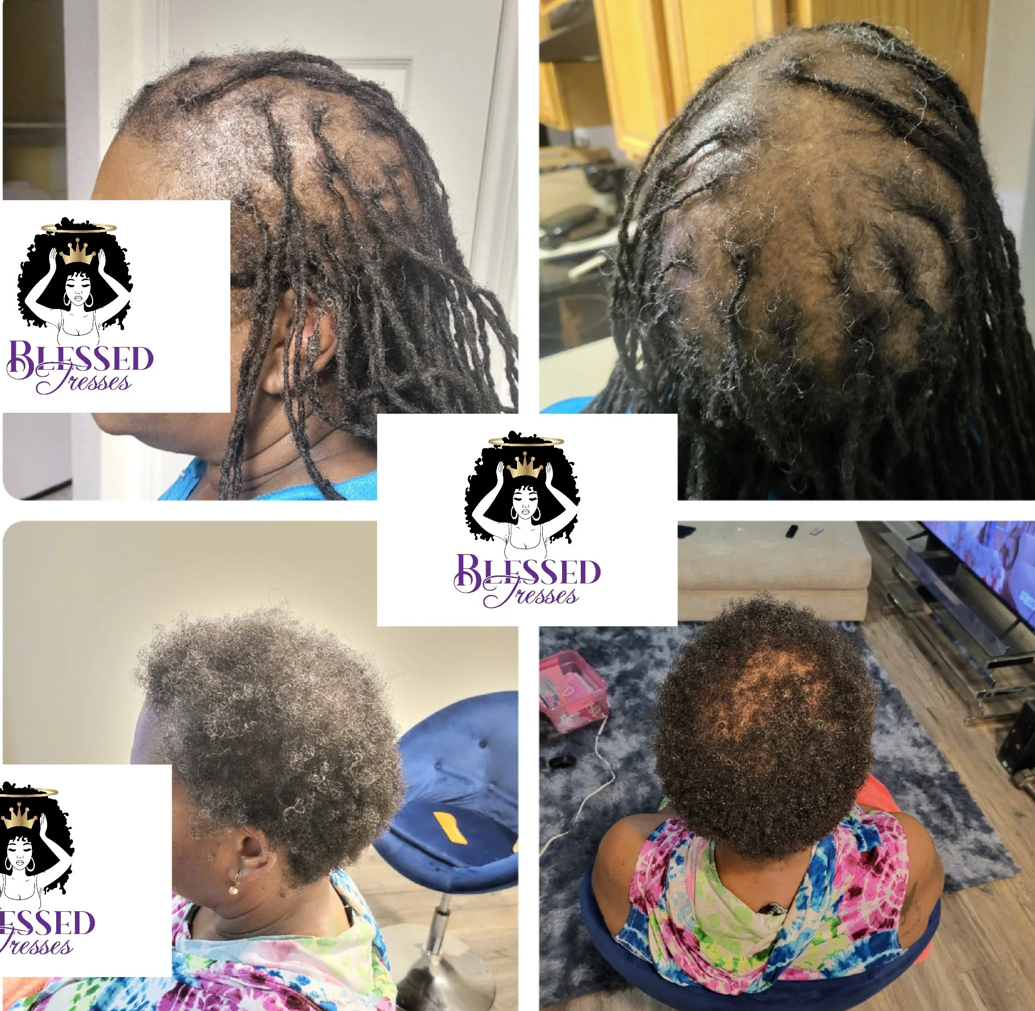 Her mother's hair still had too much tension for the strands that had thickened but could not withstand the heaviness. Her mother decided to start over and cut off her locs 4 months into using the oils. She was happy to have the weight lifted off of her and began to rejoice as her edges had been restored and the crown of her head had become fuller and had sprouted new hairs.