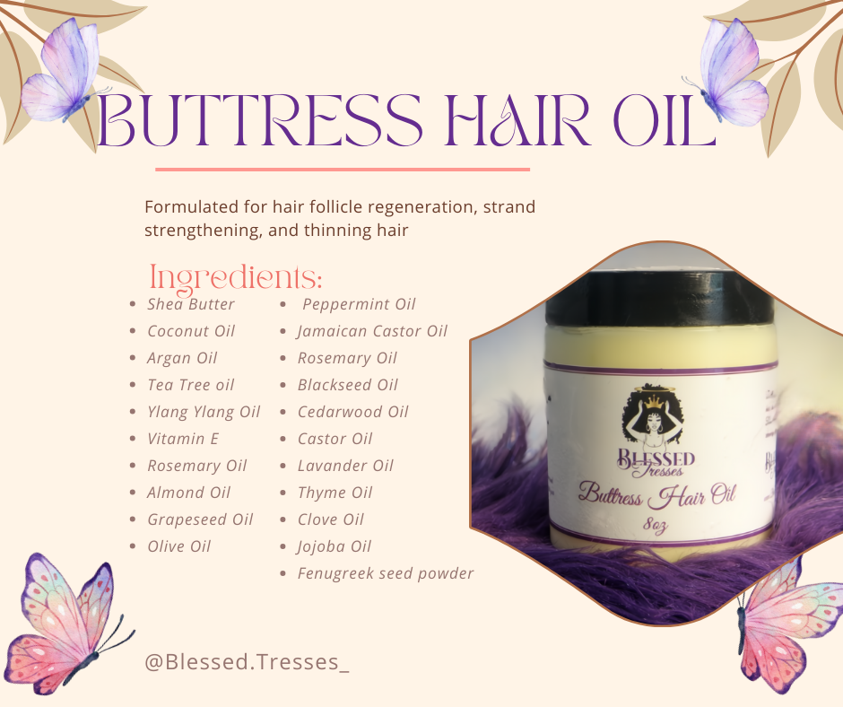 -Shea Butter -Coconut Oil - Argan Oil - Tea Tree oil - Aloe Vera - Vitamin E - Rosemary Oil - Almond Oil - Grapeseed Oil - Olive Oil - Peppermint Oil - Jamaican Castor Oil - Rosemary Oil - Blackseed Oil - Cedarwood Oil - Castor Oil - Lavender Oil - Thyme Oil - Clove Oil - Jojoba Oil - Ylang Ylang Oil - Almond Oil - Fenugreek seed powder